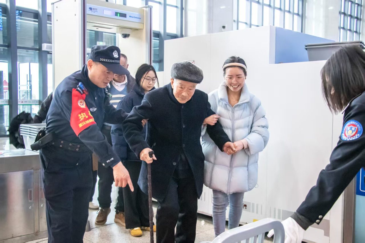 “老人家,不要着急,搞得赢。”“妹妹,包包也要过安检!”……7时20分,巫山站开站,百余名旅客陆续涌入,不大的进站口瞬间拥挤起来。高要武提高嗓音,在安检区维持秩序,协助铁路工作人员引导旅客有序安检。看到旅客扛着沉重行李步履蹒跚,他立刻上前搭手,弯腰将一件件行李平稳搬上安检机。遇到扶老携幼、行动不便的旅客,他更是第一时间伸出援手,搀扶老人、照看孩童、提拿行李,一路护送至候车区域。