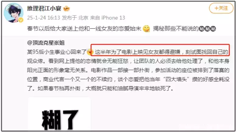 25年年初的时候,狗仔还爆料某95后小生事业心回来了,为了电影上映和女友避嫌。